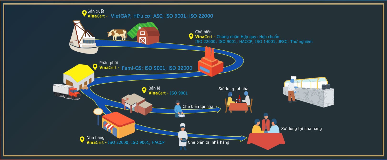 • Chứng nhận hệ thống quản lý theo tiêu chuẩn quốc tế: VinaCert cung cấp chứng nhận các hệ thống quản lý quan trọng như ISO 22000, HACCP (an toàn thực phẩm), ISO 9001 (quản lý chất lượng), ISO 14001 (quản lý môi trường), cùng các tiêu chuẩn quốc tế khác như, JFS-C, GMP Codex… giúp doanh nghiệp nâng cao năng lực quản trị và đáp ứng yêu cầu của thị trường toàn cầu.